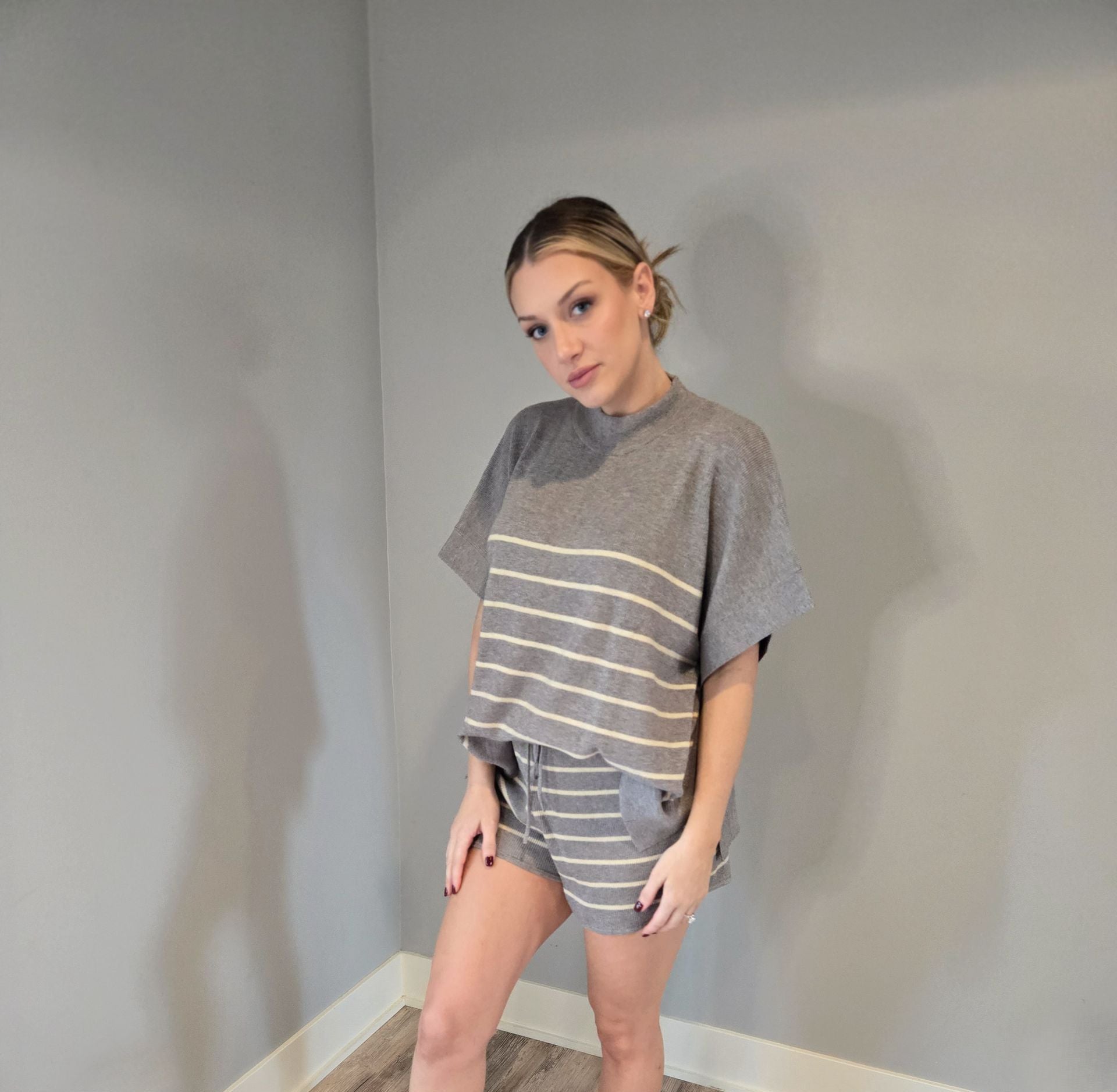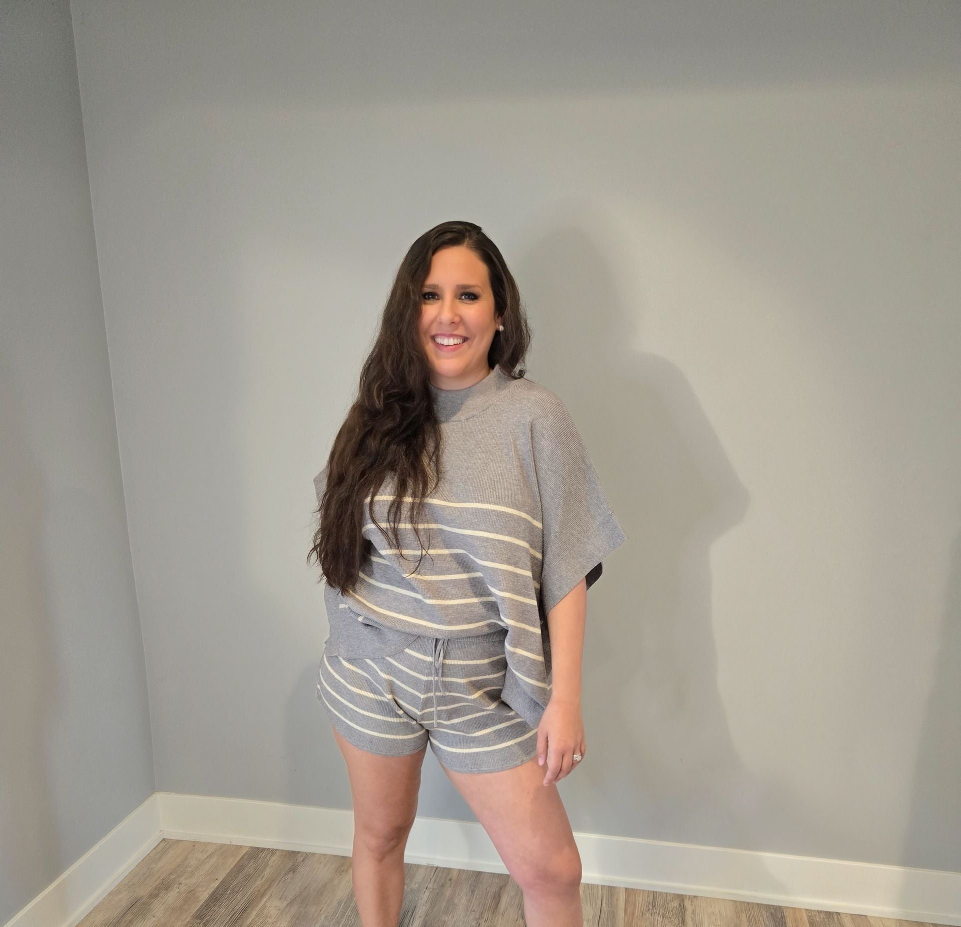 FINAL SALE - 2 Piece Knit Set Grey Stripe Poncho Sweater Top and Drawstring Shorts