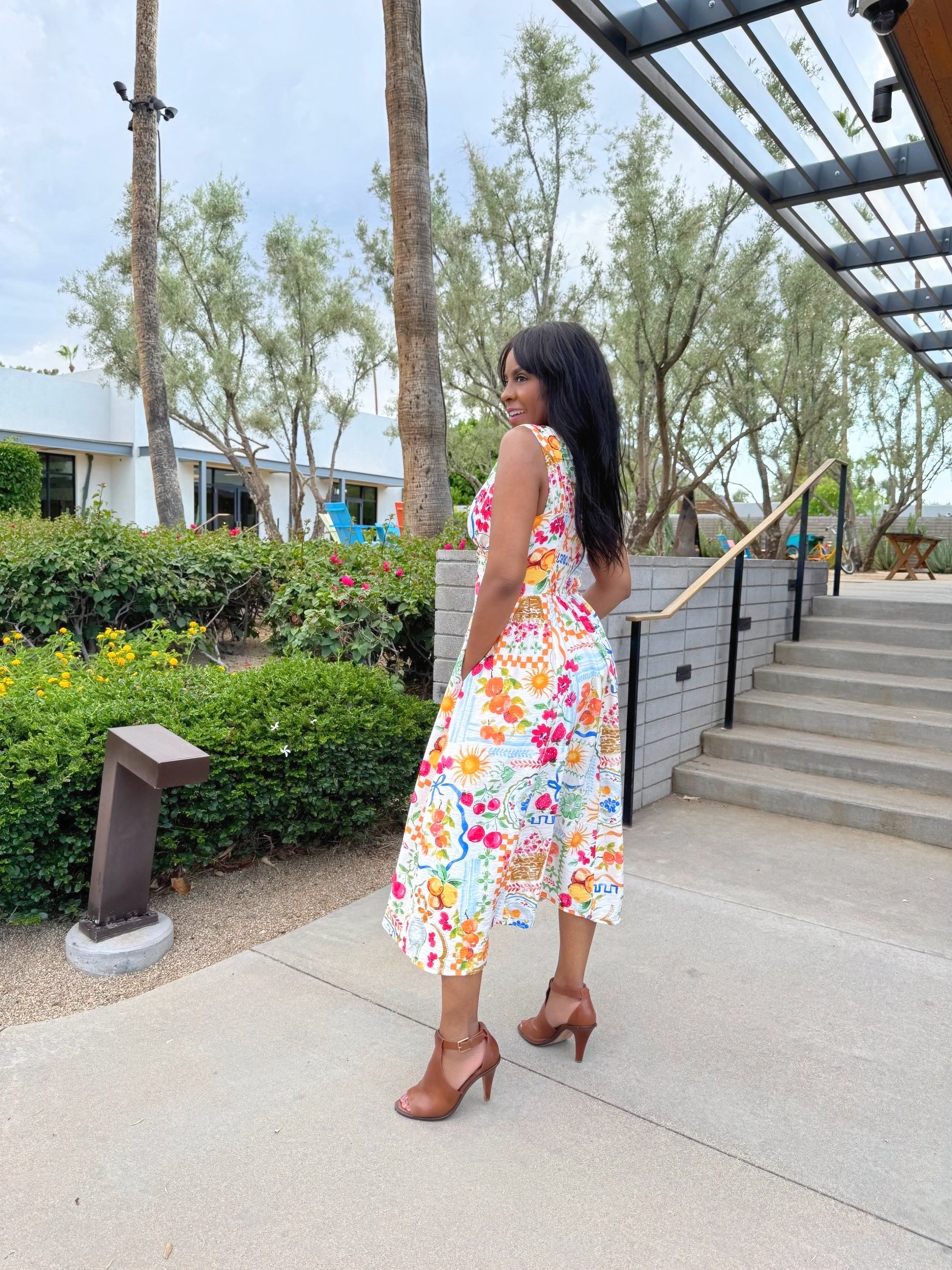 Crafted with a vibrant, tile-inspired print that’s equal parts whimsical and chic, it’s detailed with a flattering fit-and-flare silhouette, functional side pockets (yes, pockets!), and a concealed zipper in the back for a smooth finish. The midi length keeps it classy, while the corset construction adds just the right touch of sexy sophistication.