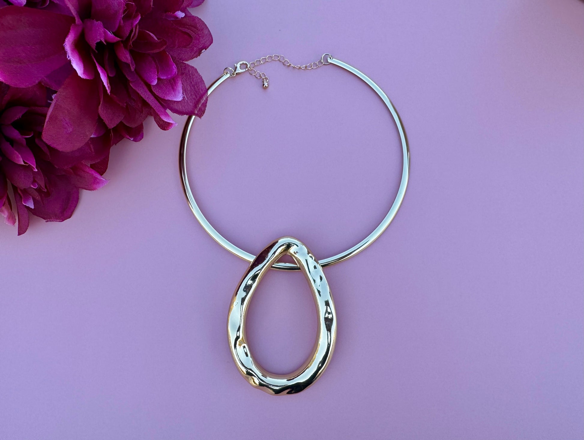 Inspired by coastal ease and sculptural modern art, this gold-toned collar features a fluid pendant drop that catches the light with every move.