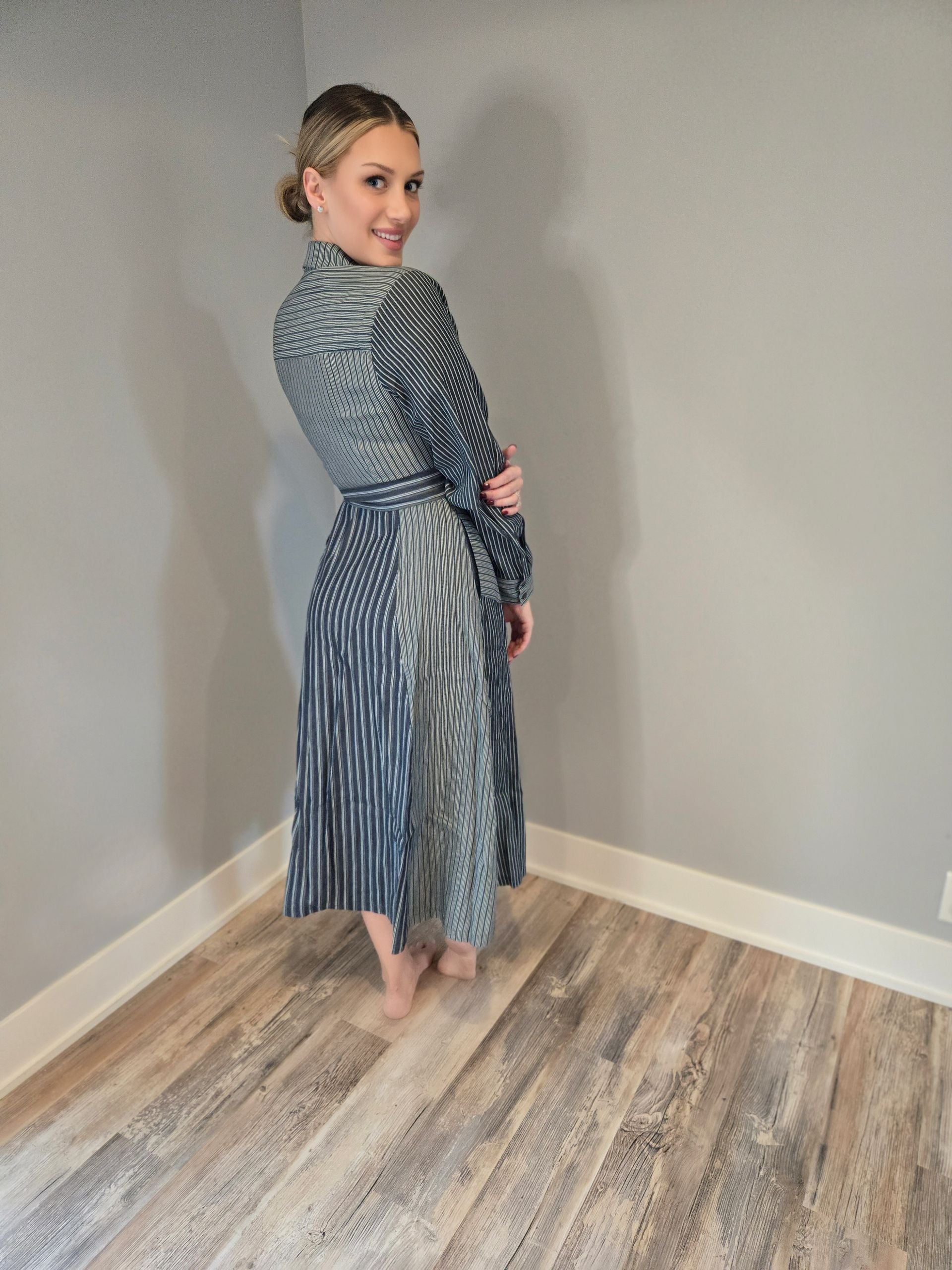 This striped woven midi dress combines classic sophistication with a modern twist. Featuring a surplice neckline and shirt collar, it exudes polished elegance, while the button-down front and long sleeves add a refined touch. The dress is complete with a self-belt to cinch the waist, side pockets for convenience, and a flowing full skirt that offers effortless movement. A versatile piece perfect for both workdays and special occasions.