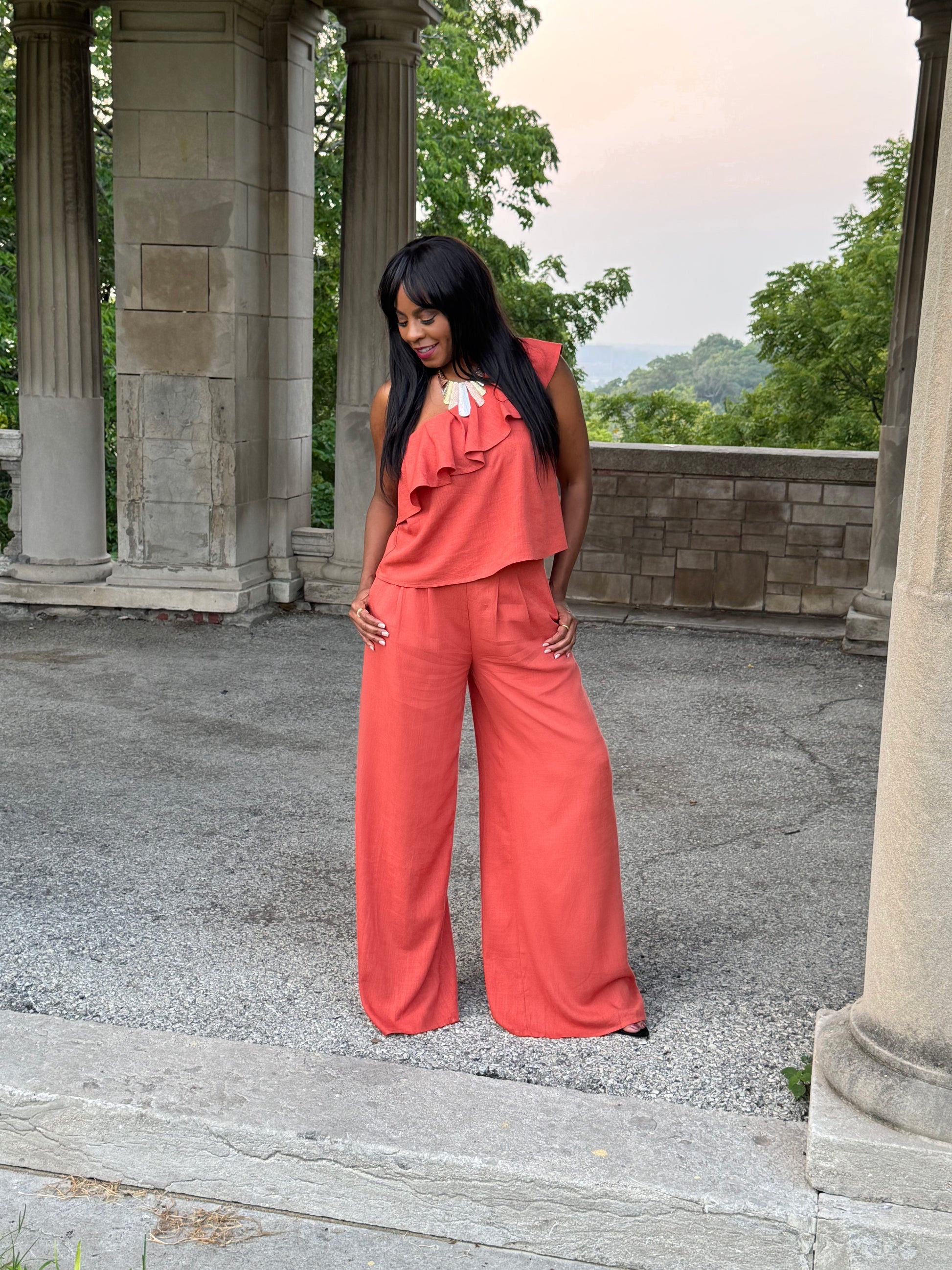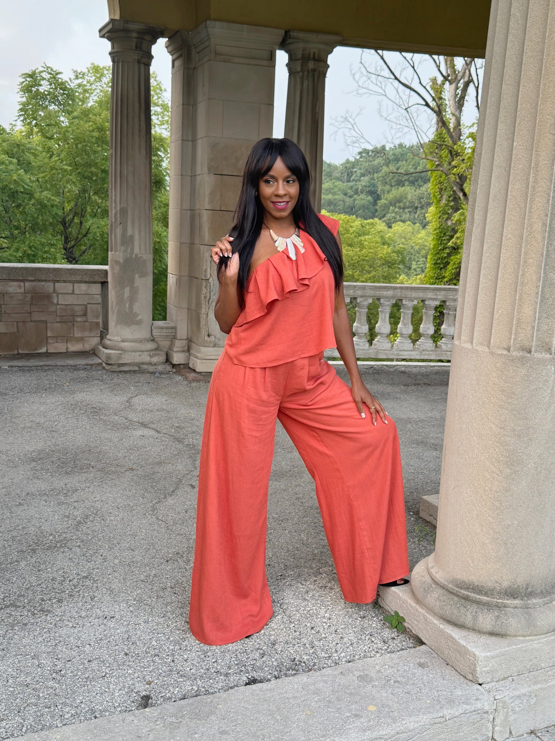 Elevate your wardrobe with this effortless two-piece Sunset Muse linen set designed to make a statement. Featuring a one-shoulder ruffle top and wide-leg pants with an easy, flattering fit, this set is perfect for sun-drenched afternoons, date nights, or stylish getaways. Crafted from breathable linen for a luxe, lightweight feel that moves with you.